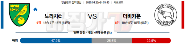 2026-04-22 잉글랜드 챔피언쉽 노리치 시티 FC 더비 카운티 해외축구분석 무료중계 스포츠분석