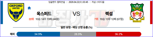 2026-04-22 잉글랜드 챔피언쉽 옥스포드 유나이티드 FC 렉섬 해외축구분석 무료중계 스포츠분석