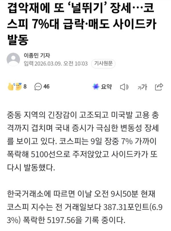 중동 지역의 긴장감이 고조되고 미국발 고용 충격까지 겹치며 국내 증시가 극심한 변동성 장세를 보이고 있다. 코스피는 9일 장중 7% 가까이 폭락해 5100선으로 주저앉았고 사이드카가 또다시 발동했다. 한국거래소에 따