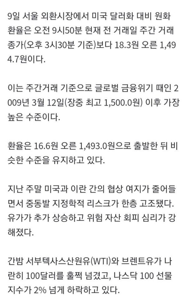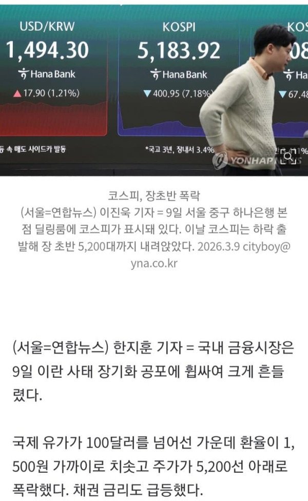 환율, 금융위기 이후 최고…방산株조차 하락세 3년물 국채 금리 연 3.4% 상회…비트코인도 1억원 깨져 국내 금융시장은 9일 이란 사태 장기화 공포에 휩싸여 크게 흔들렸다. 국제 유가가 100달러를 넘어선 가운데 환
